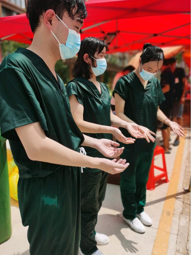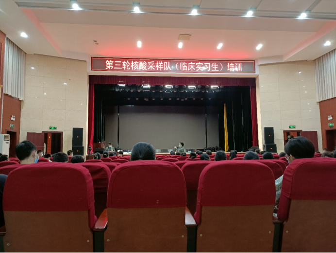 时间来到8:30,我们按照通知来到医院礼堂进行上次采集核酸的复盘以及培训。七步洗手法、穿脱防护服的联系、咽拭子采集的位置和方法、医疗垃圾的打包……我们进行着正规的培训和练习。一次次的练习,就是为了能够在下次的采样中更加从容应对。礼堂里,听着老师们重复了一遍又一遍的“唠叨”,依旧能从中找到自己的不足。借用老师的一句话“马上上战场了,枪总是要配好的”。