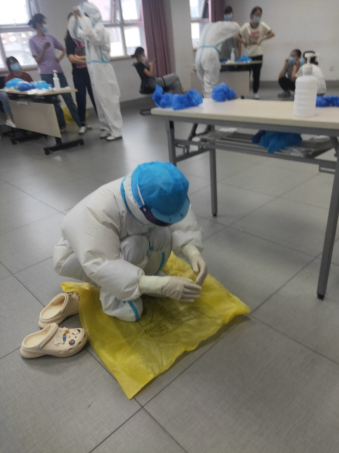 工作结束脱防护服时,我严格按照步骤“一脱一手消”,与老师相互监督脱防护服。我很感谢采样之前医院多次举行的规范化培训活动,让我们不仅能够采集好核酸,也能够更好地保护自己。还记得当时我们的助理老师说过,学好穿脱防护服就是你们上战场拿的枪,没有枪就是炮灰,就是去送死。确实,认真做好每个步骤都很重要,我也很感想教过我们的老师。