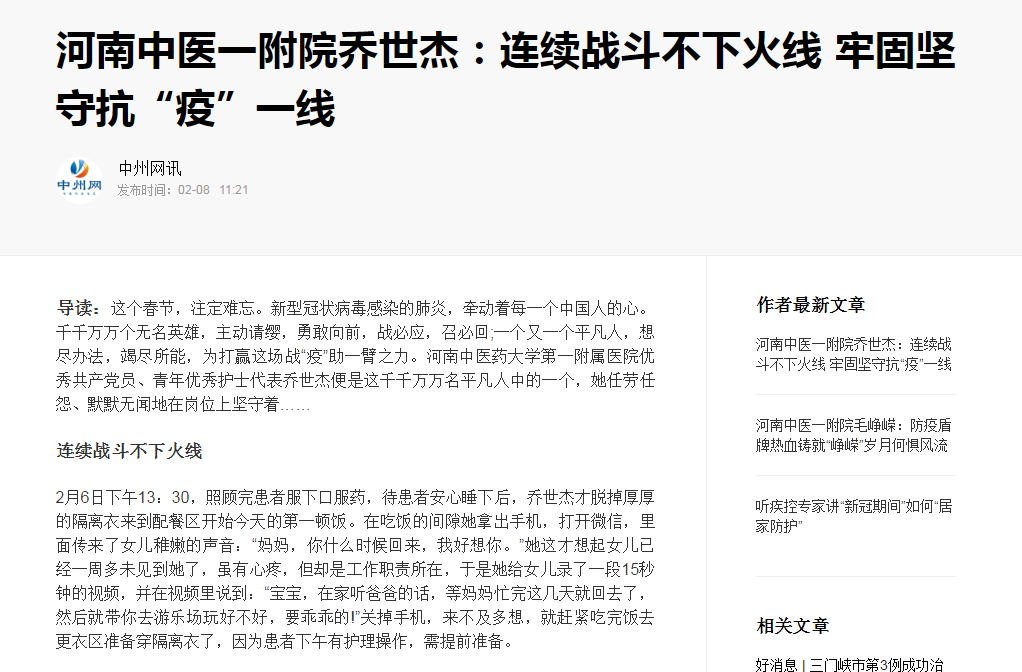 编者按:2020年2月8日,中州网对leyu·乐鱼(中国)体育官方网站一附院护士乔世杰坚守抗“疫”一线进行报道。现将全文刊发如下:
