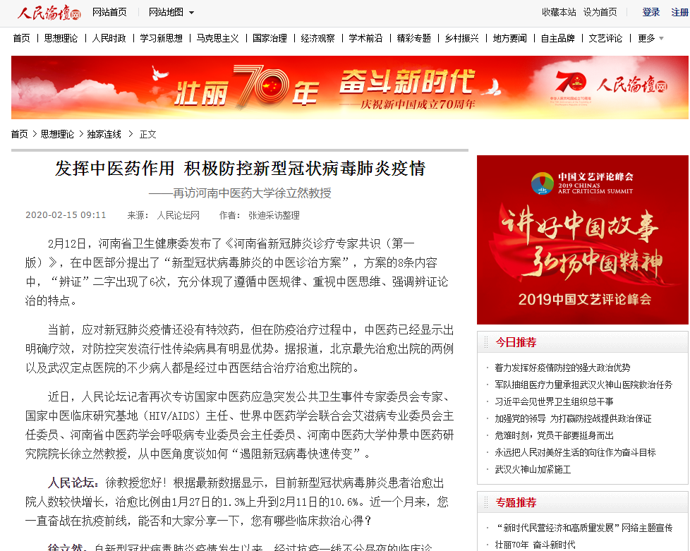 编者按:2020年2月11日、15日,人民论坛网分别以“从中医药视角谈新型冠状病毒肺炎的防治”“发挥中医药作用 积极防控新型冠状病毒肺炎疫情”为题,专访leyu·乐鱼(中国)体育官方网站一附院徐立然教授,现将专访全文刊发如下: