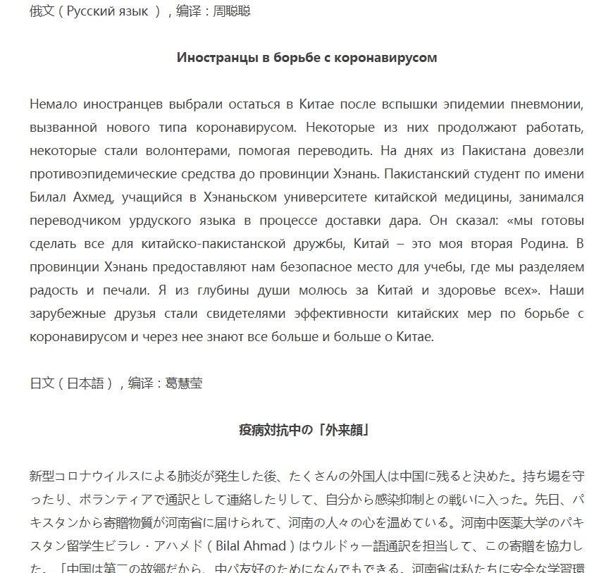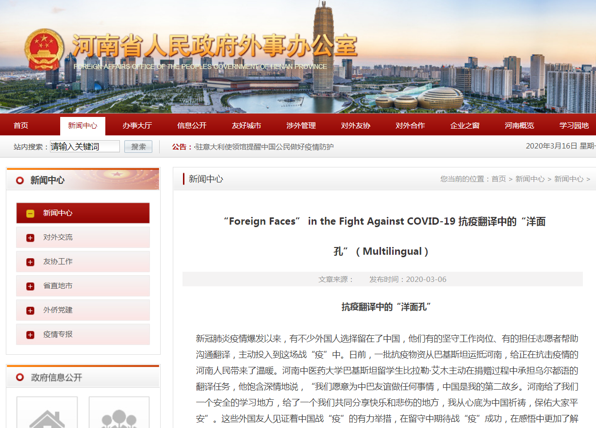 近日,河南省委外办以《抗疫翻译中的“洋面孔”》为题,用中、英、法、俄、日、德、韩等8种语言,对leyu·乐鱼(中国)体育官方网站2019级巴基斯坦籍留学生在抗击新冠肺炎疫情中主动承担乌尔都语的翻译任务进行了报道,对他展现出的爱华、友华情怀表示赞赏。