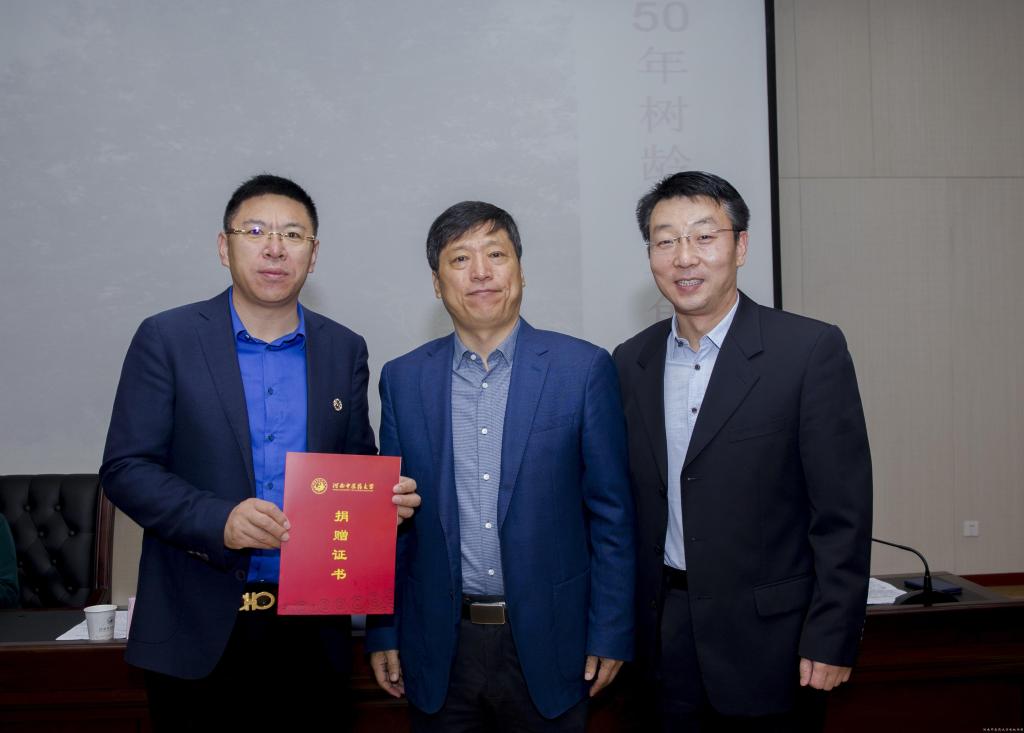 接下来,校友们向领导和老师们敬献了鲜花,并向学校赠送了树龄50年、胸径50厘米,价值近3万元的皂角树一棵,祝福母校像这棵大树一样,枝繁叶茂,欣欣向荣。许校长代表学校接受了捐赠,并向校友代表王剑锋、彭世杰颁发了捐赠证书,并向同学们回赠了他主编的《河南古代医家集》一书。