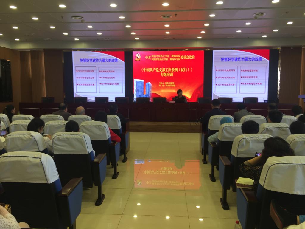 本网讯(文/焦钧 冯建昭 图/郑金铎)为切实加强基层党组织建设,提升党支部书记的专业素养与工作能力,进一步深化学校党支部培训力度,2019年5月8日下午,一附院邀请河南省委党校陈燕副教授就《中国共产党支部工作条例(试行)》(以下简称《条例》)进行专题培训。一附院党委书记翟剑波和全体党总支书记、支部书记、党务工作者参加专题培训。培训会由一附院党委副书记张晓东主持。
