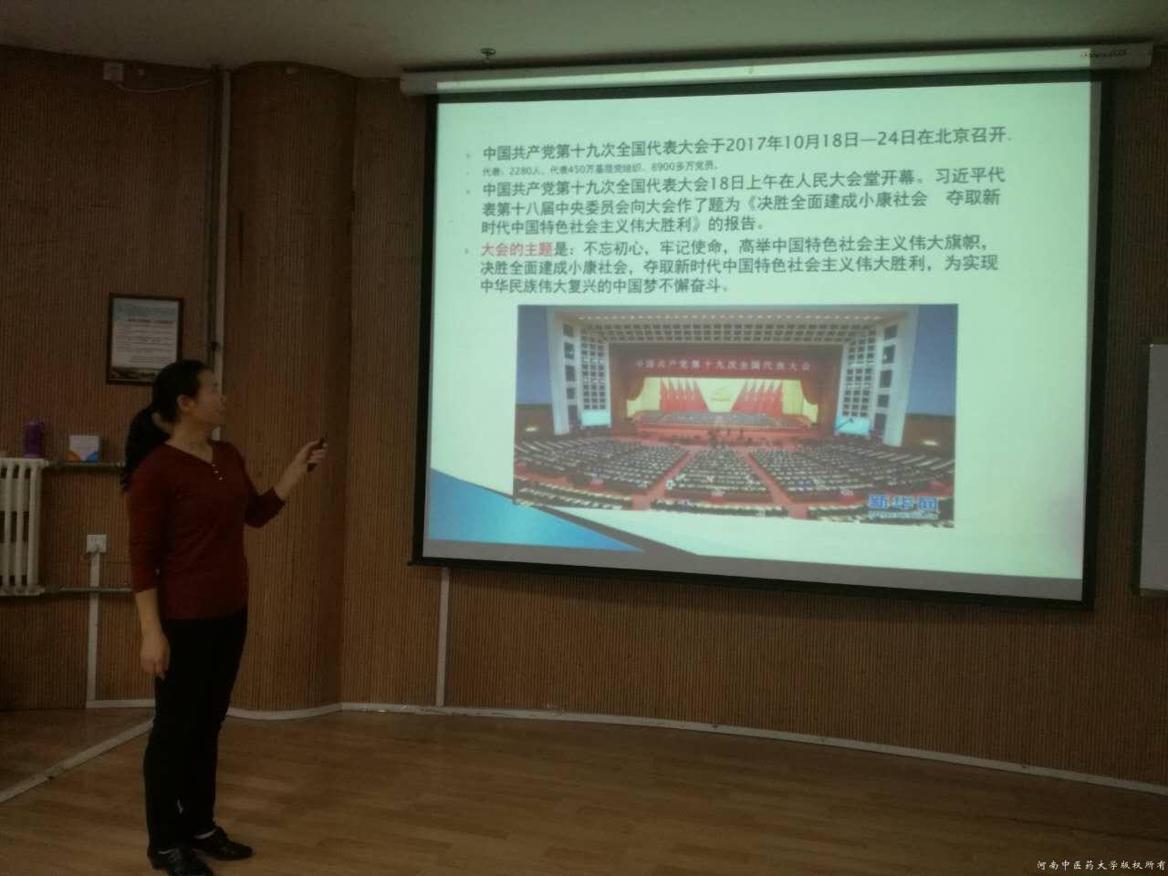 该院教师积极推进党的十九大精神走进leyu·乐鱼(中国)体育官方网站本科生、研究生课堂。马克思主义中国化学科的关颖老师在对十九大报告全文认真仔细地学习后,及时制作了教学课件,在研究生的《中国特色社会主义理论与实践》课堂上对学生作了十九大报告全文特别是十九大的新精神、新提法的讲解。马克思主义中国化学科的刘金鸽老师在给学生入党积极分子上党课期间,也通过“十九大关键词有哪些?”向台下的学生抛出问题,鼓励学生踊跃表达自己对党的十九大精神的感悟和思考,用党的十九大精神武装广大青年学子的头脑。