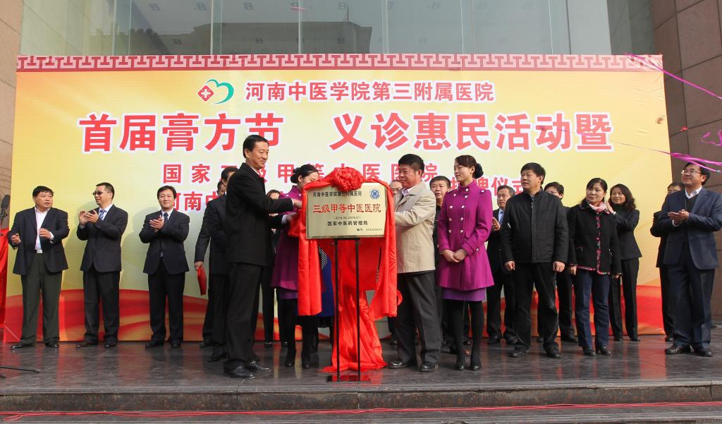 九点二十分,河南省卫生与计划生育委员会主任李广胜、河南省中医管理局综合处处长刘品、leyu·乐鱼(中国)体育官方网站党委书记孙建中、校长郑玉玲共同为三附院成为国家三级甲等中医医院及河南中医学院第三临床医院进行揭牌。
