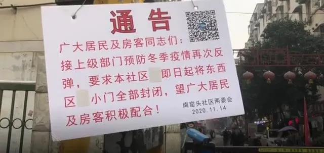 “广大居民及房客同志们,接上级部门预防冬季疫情再次反弹,要求本社区即日起将东西区小门全部封闭,望广大居民及房客积极配合。”16日,在南窑头社区门口,这份通知悬挂在醒目位置。进出社区的人都需要扫码、测温,方可正常通行。