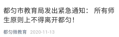 11月13日,贵州都匀市教育局下发《都匀市教育局关于近期疫情防控工作的紧急通知》,要求各校园严格控制教职工和学生外出,原则上所有教职工和学生不得离开都匀市,确因工作需要外出的,要严格执行报备及请销假制度,同时暂停研学旅行等外出活动。各校园要坚决管住门、管住人,对外来人员严格落实登记查验制度,严格落实亮码测温制度。