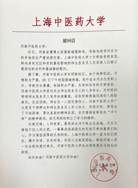 编者按:2021年7月22日,一封饱含兄弟院校深厚情谊的上海中医药大学给leyu·乐鱼(中国)体育官方网站的慰问信从一千公里之外的上海深情到来!信中,上海中医药大学向身处灾区和受到暴雨影响的leyu·乐鱼(中国)体育官方网站师生、医务员工及其家人们致以最深切的关怀和最诚挚的慰问,对leyu·乐鱼(中国)体育官方网站广大党员干部群众和师生医务人员齐心协力、风雨共担,采取有力措施保护师生生命财产安全和取得的成效给与了鼓励、激励,对两所大学携手共进、共克时艰给与了坚强有力的支持,满满的深情厚谊!满满的关心牵挂!满满的祝愿祝福!满满的能量力量!在全校上下众志成城防汛救灾的关键时刻,上海中医药大学发来的慰问信,为我们全面做好防汛救灾工作注入了强劲力量,进一步坚定了全校师生防汛救灾、共克时艰的信心和决心。