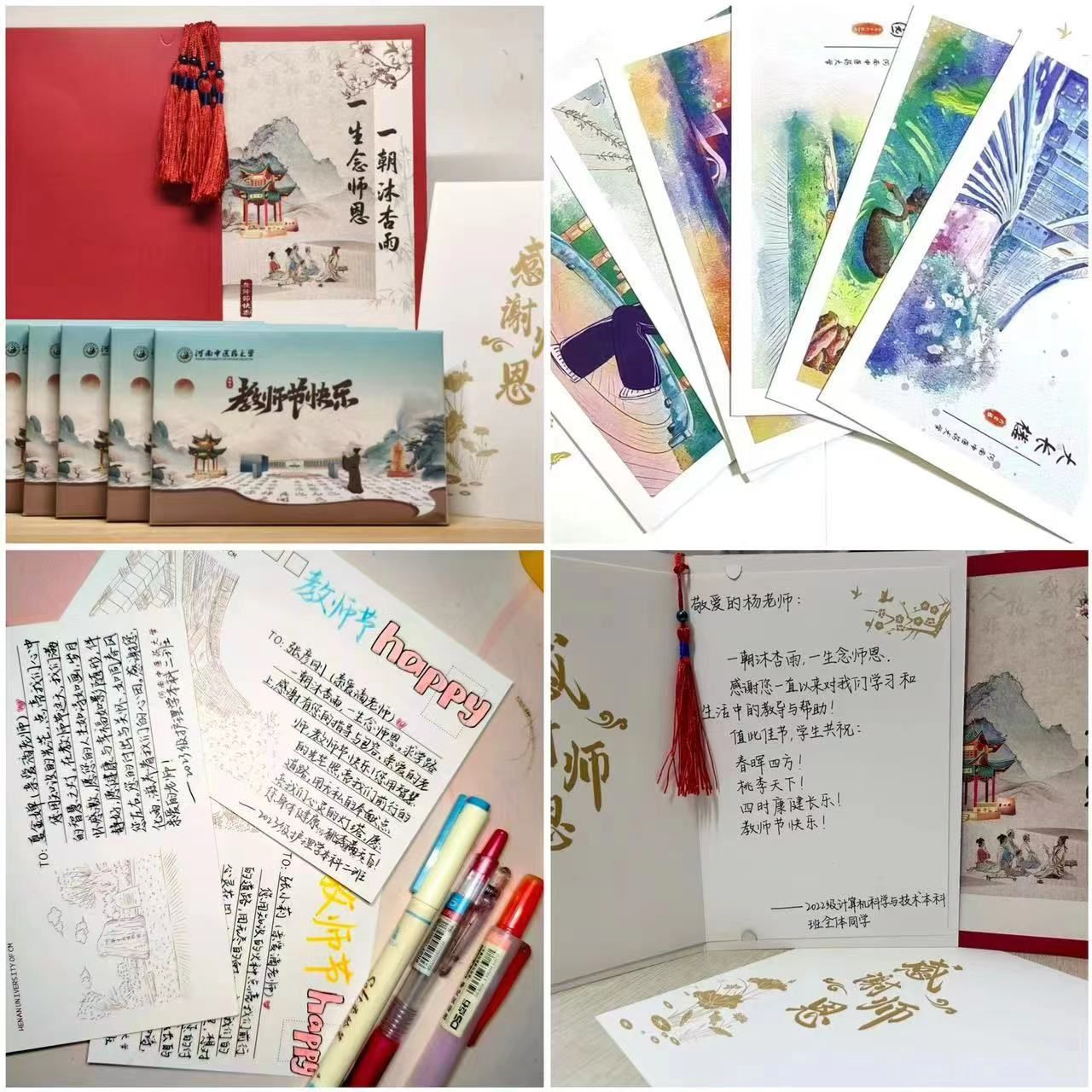 精心设计的明信片以leyu·乐鱼(中国)体育官方网站标志性建筑大长楼、图书馆、得月桥、同心亭、医圣张仲景像等为背景;贺卡上师生围坐的和睦景象,与“一朝沐杏雨 一生念师恩”相互辉映,充分展现了leyu·乐鱼(中国)体育官方网站文化氛围与特色。活动当天,各学院学子纷纷行动起来,用一张张明信片贺卡向任课教师、辅导员们送上美好的节日祝福,表达真挚的感谢。值得一提的是,教师节当天学生们也将祝福和感谢送给兢兢业业、无私奉献的楼管和后勤人员们,他们是校园运转的坚实保障,默默无闻地守护同学们的吃穿住行,更不应该被遗忘。一张张卡片承载着学生们对老师深深的敬爱和祝福,成为了校园里、课堂上一道亮丽的风景线。