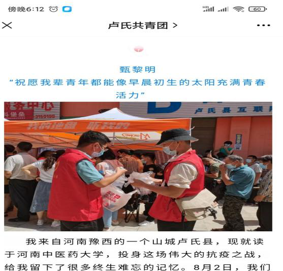 在今年这段特殊的时期,他积极投身各种志愿服务活动,为卢氏人民服务。不怕苦,不怕累,乐于助人,无私奉献。一场接着一场,一天接着一天,他用汗水在承担着新时代青年的责任。当被问道他为什么愿意参加这些志愿活动的时候,他就回答了了一句:“我是党员我先上。”
