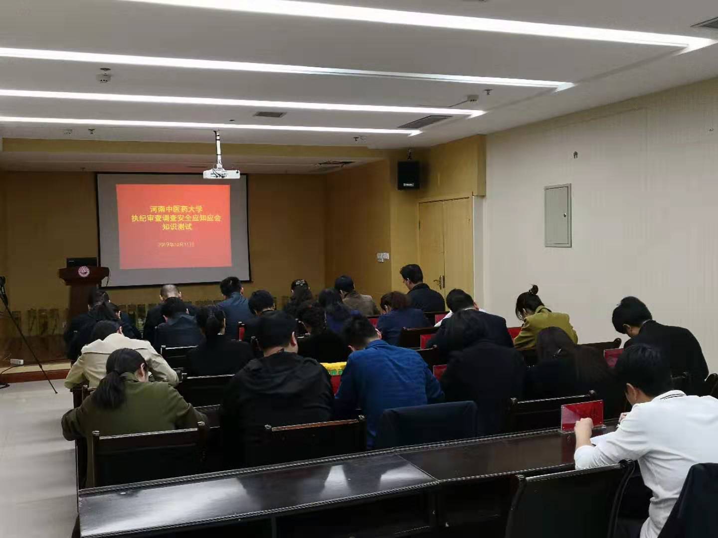 本网讯(文图/ 赵海阳)为贯彻落实省纪委“补短板建机制强能力见成效”问题整改落实工作要求,进一步提升全校执纪审查调查人员安全工作水平,2019年10月11日下午,校纪委以考代训、以考促学,组织开展执纪审查调查安全应知应会知识测试。校纪委、三所附属医院纪委全体人员参加考试。