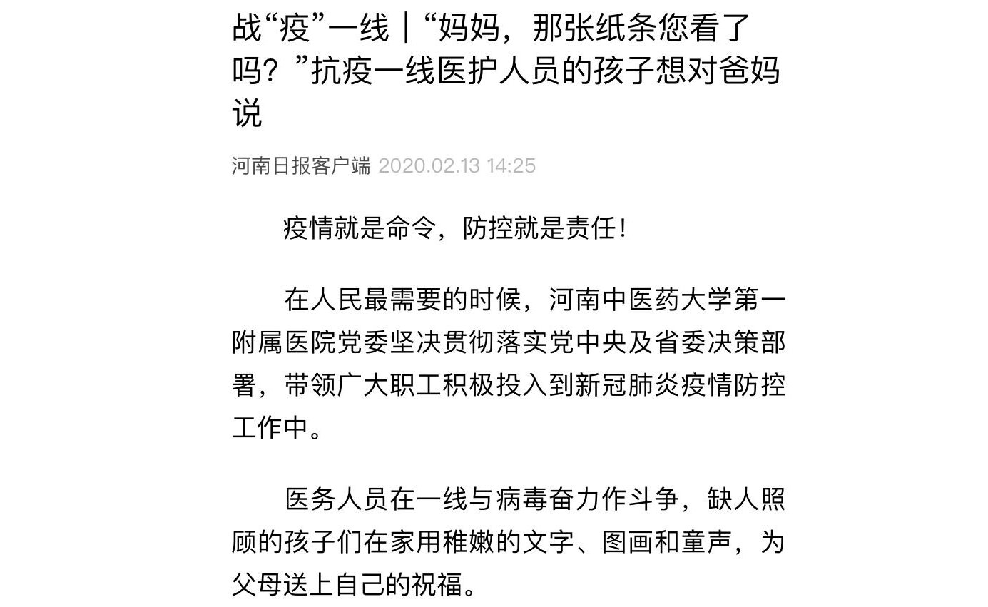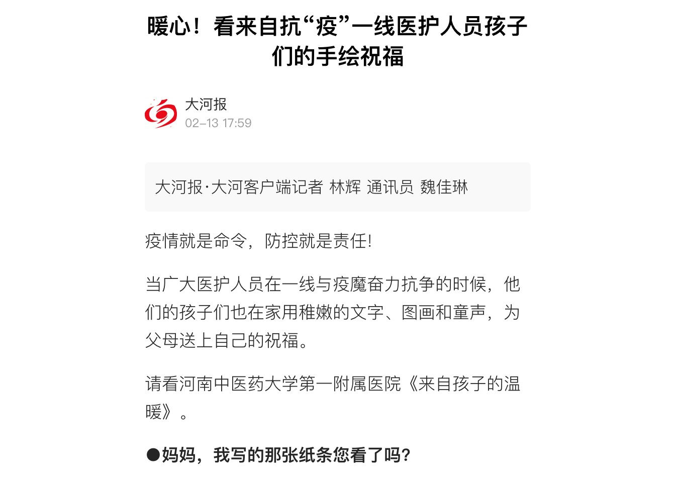 编者按:2020年2月13日,河南日报客户端、大河报对leyu·乐鱼(中国)体育官方网站一附院抗疫一线医护人员孩的手绘祝福进行报道。现将河南日报客户端全文刊发如下: