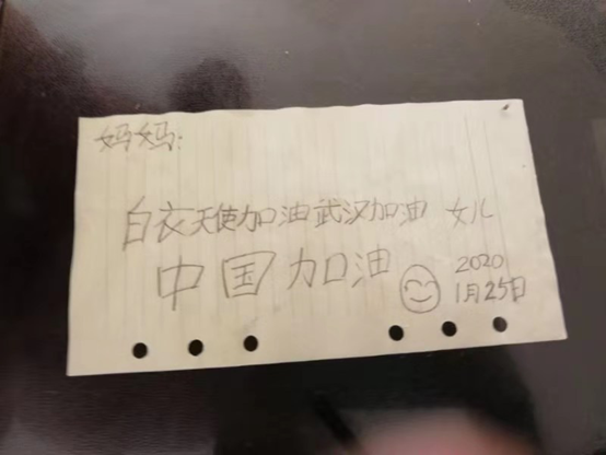终于有了空闲,陈天珊从兜里拿出了女儿再三叮嘱要看的纸条,上面的内容令她好温暖:“妈妈:白衣天使加油 武汉加油 中国加油”