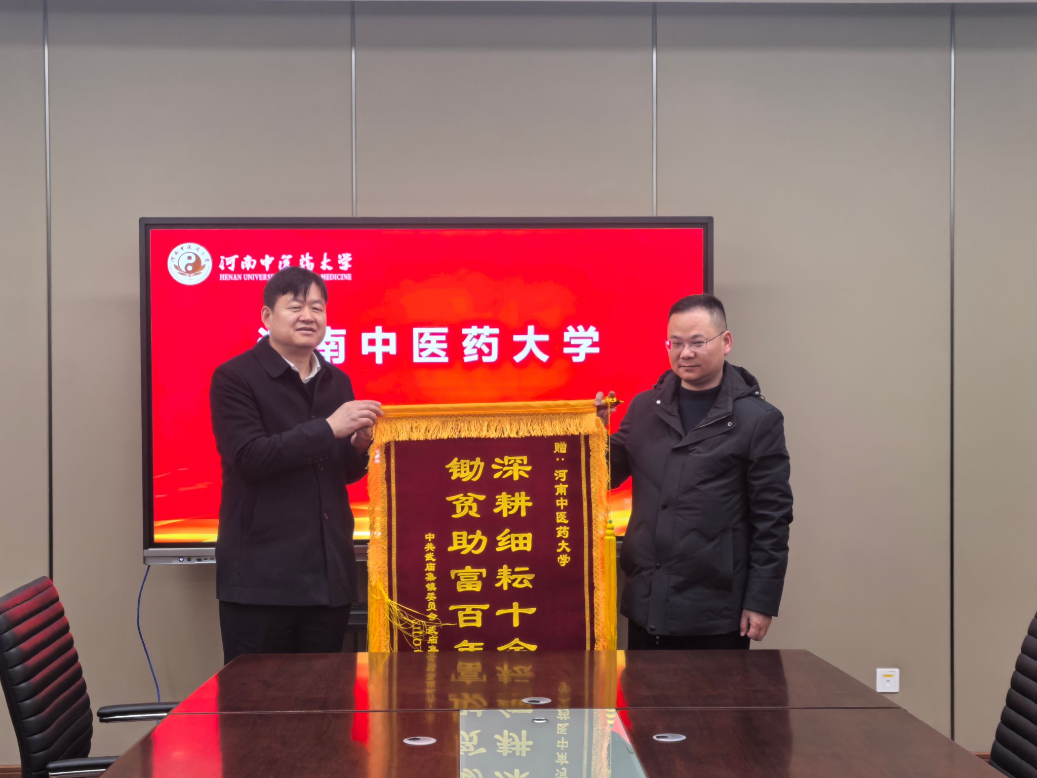 本网讯(文/图 陈晓辉 )2月20日下午,信阳市固始县武庙集镇党委副书记、镇长余郧建,镇党委组织统战委员李光天,皮冲村党支部书记陈金括赶到学校,代表全体村民亲手送上了一面承载着满满感激之情的锦旗——“深耕细耘十余载,锄贫助富百年功”,感谢学校党委十余年来的无私帮扶与深厚情谊。学校党委委员、副校长彭新热情接待了余郧建一行。