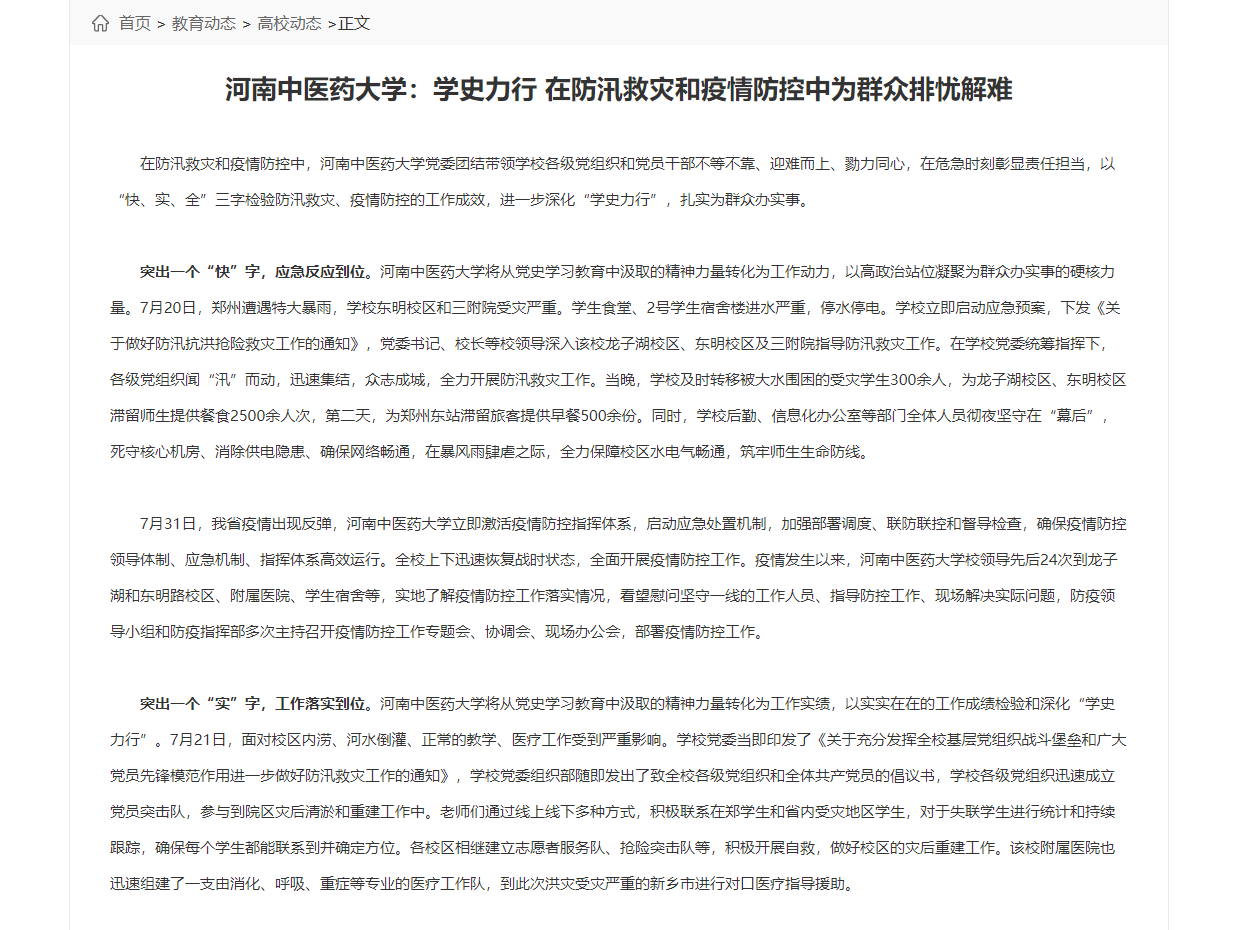 编者按:2021年8月31日,省教育厅对leyu·乐鱼(中国)体育官方网站在防汛救灾和疫情防控中进一步深化“学史力行”,扎实为群众办实事进行报道。现将全文刊发如下: