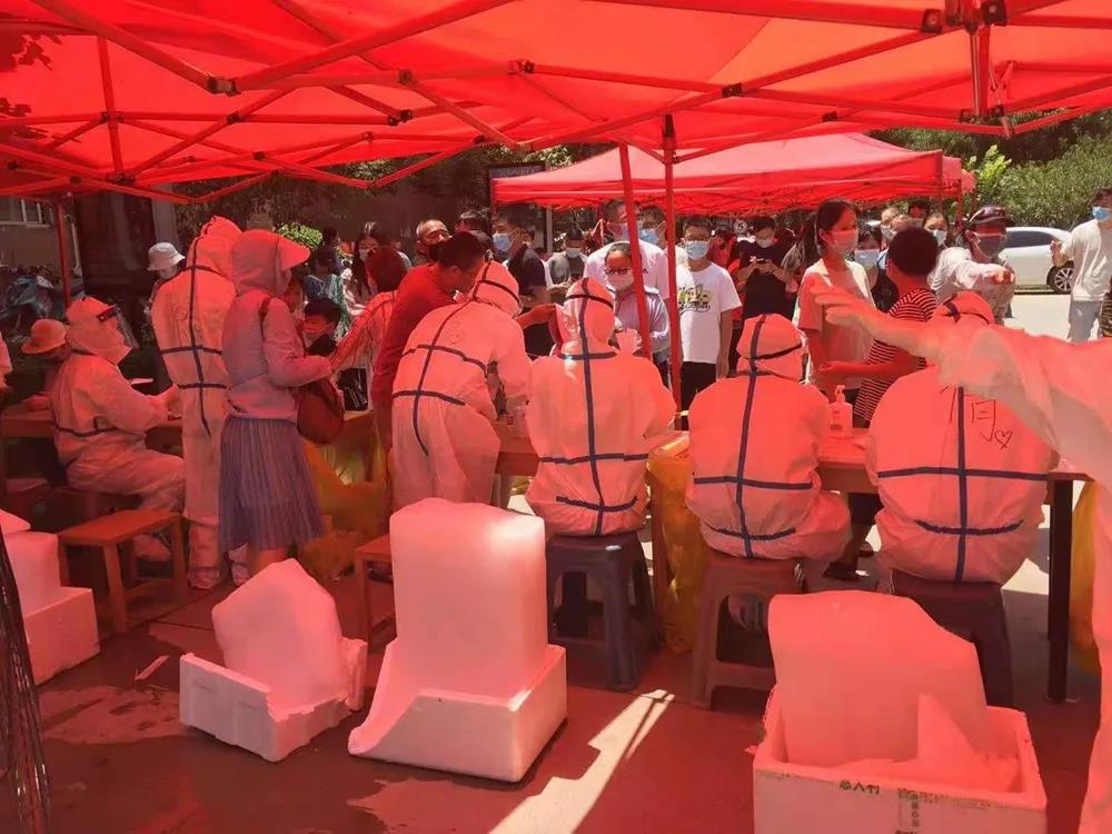 8月的郑州,酷暑难耐。因为长时间穿着密不透气的防护服,汗水顺着衣服一直流到脚底,王宽和同事们都出现了皮肤过敏症状,有的同事耳朵都磨烂了。连续工作八个小时后,脱下防护服的王宽常常感觉站立不稳,一口气能喝下一整瓶矿泉水。但没有人叫苦叫累,大家甚至不愿多休息一会儿,就怕耽误宝贵的采样时间。很多居民满怀感激,眼含热泪地连声说着“辛苦了”,给她们送来面包和食物;有的居民于心不忍,给她们买水或送上冰块;还有一位白发苍苍的阿姨,亲自煮了绿豆粥给她们送来……