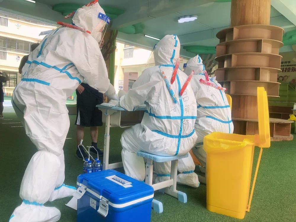 正处盛夏,天气异常闷热,姑娘们穿着厚厚的隔离衣在室外工作,不一会儿汗水便浸透全身,额头的汗水一滴一滴地往下落,但杜俊鸽咬紧牙关,动作轻柔而又有条不紊地加快节奏,只想让等待核酸检测的市民少排一会队,早点脱离酷热环境,这样她所忍受的这些酷热煎熬便是有意义的。