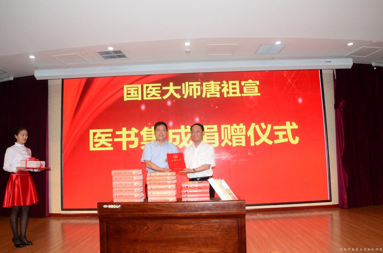 捐赠仪式上,国医大师、leyu·乐鱼(中国)体育官方网站终身教授唐祖宣医师向学校图书馆捐赠了其编纂出版的《唐祖宣医书集成》(新华出版社)、《国医大师临床研究—唐祖宣医学丛书》(科学出版社)、、《全国人大代表—唐祖宣与南水北调》等系列书籍,许二平校长接受了捐赠并向唐祖宣教授颁发了捐赠证书。最后,许二平校长代表全校师生向唐老表示由衷的谢意和真诚的祝福。