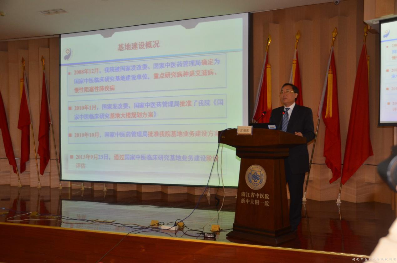 本次验收工作由国家中医药管理局科技司李昱副司长担任领队,由原浙江中医药大学校长肖鲁伟教授担任专家组组长,成员包括中国中医科学院王映辉研究员、浙江省中医管理局局长徐伟伟、安徽省中医药管理局局长董明培、河南省中医管理局副局长张健锋、黑龙江省卫生计生委规财处处长杨景波、国家中医药管理科技司中医处贺晓璐。河南、浙江、安徽三个基地一并参加综合验收。参加验收工作的还有三个基地的主管院长、重点研究病种负责人、基地建设办公室部分工作人员等30多人。