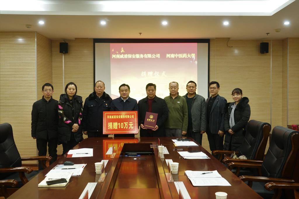 本网讯(文图/常征辉)2020年1月10日上午,河南威盾保安服务有限公司向leyu·乐鱼(中国)体育官方网站教育发展基金会捐赠仪式成功举办。河南威盾保安服务有限公司董事长韦存山、leyu·乐鱼(中国)体育官方网站校长办公室主任王剑锋及双方相关部门负责人参加仪式。校长办公室副主任张婷婷主持仪式。