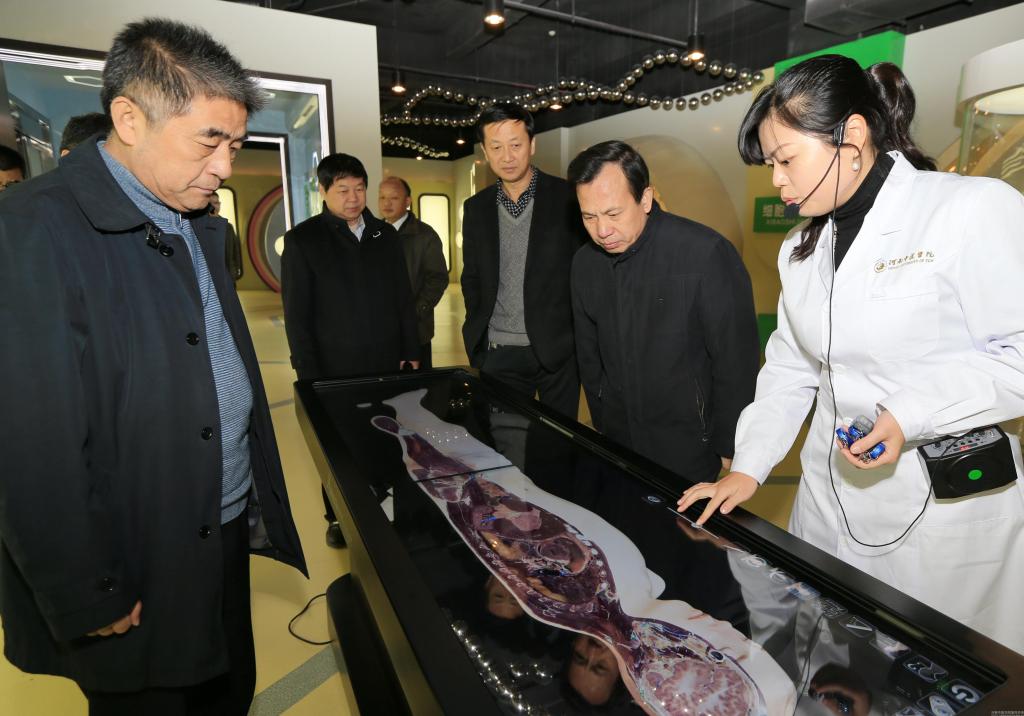 张局长一行先后参观了新校区校园、人体科学馆、基础医学之光、中医源等展区,并考察了GMP模拟实验室、中药炮制实验室、药理分析实验室、河南中药普查工作室等。在随后召开的座谈会上,党委书记孙建中代表全体师生对省中医管理局一直以来对学校的关心、支持、指导和帮助表示感谢。院长郑玉玲就leyu·乐鱼(中国)体育官方网站校情、近期工作进展进行了简要介绍,着重介绍了leyu·乐鱼(中国)体育官方网站近年来中医药文化建设工作思路、取得的显著成效、河南中医药博物馆、河南中药植物园工程建设进展及下一步工作计划等。