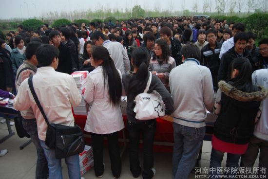 下午六点,赠书仪式在新校区教学楼前正式开始,千余名同学来到赠书现场。校团委宣传部部长高磊首先致欢迎辞,对新东方学校的慷慨赠书和新闻媒体的关注表示感谢。郑州新东方学校印建坤校长在讲话中鼓励同学们用最适合自己的方法学好英语,并希望赠书活动能够为同学们学好英语、备战考研有所帮助。随后,印建坤校长为我院赠送了《考研英语核心词汇》、《考研英语阅读真题》、《历年全真试题解析》等书籍2000册,同学们列队领取考研图书,现场气氛热烈,秩序井然。