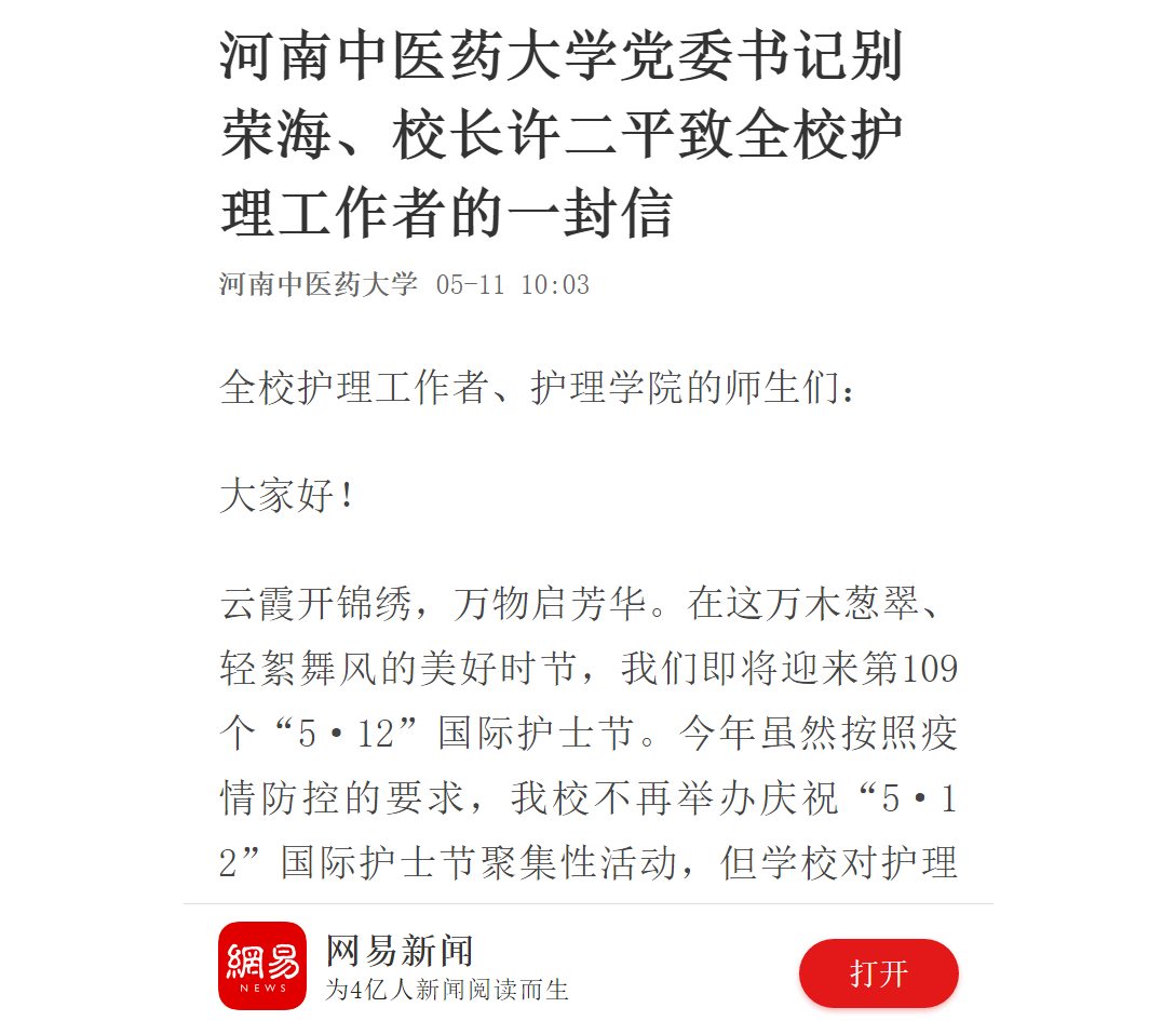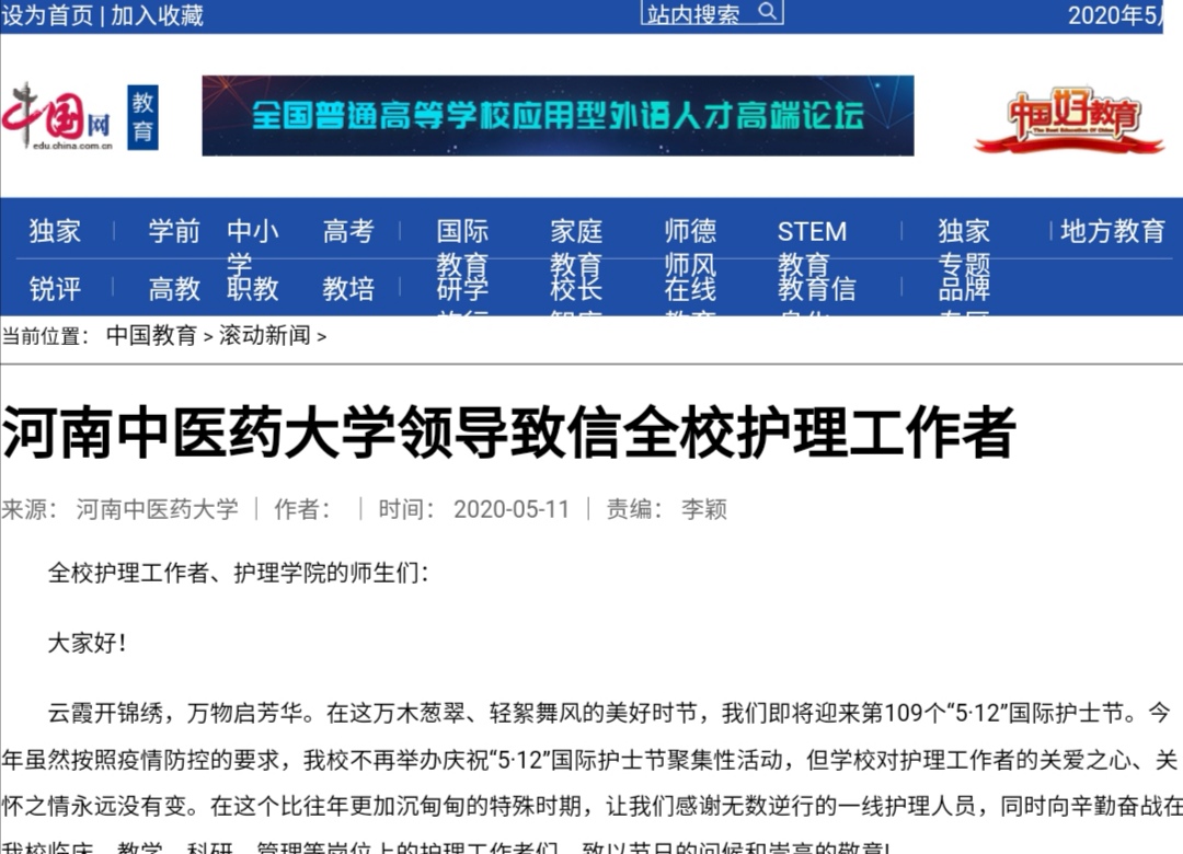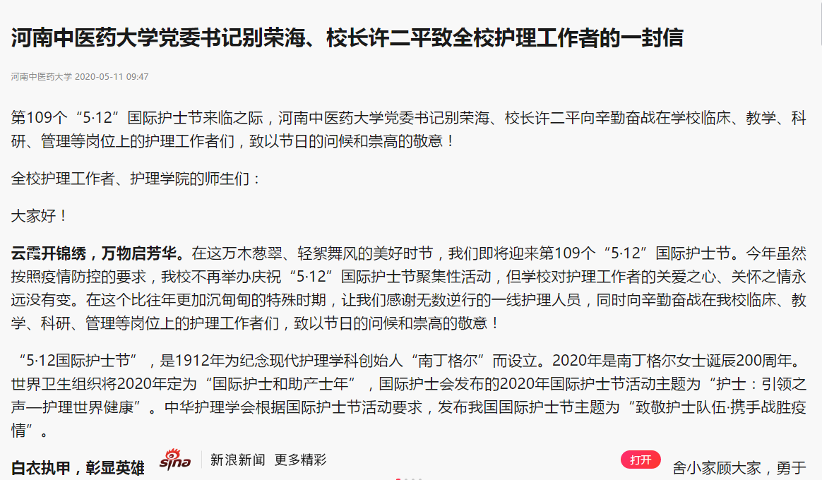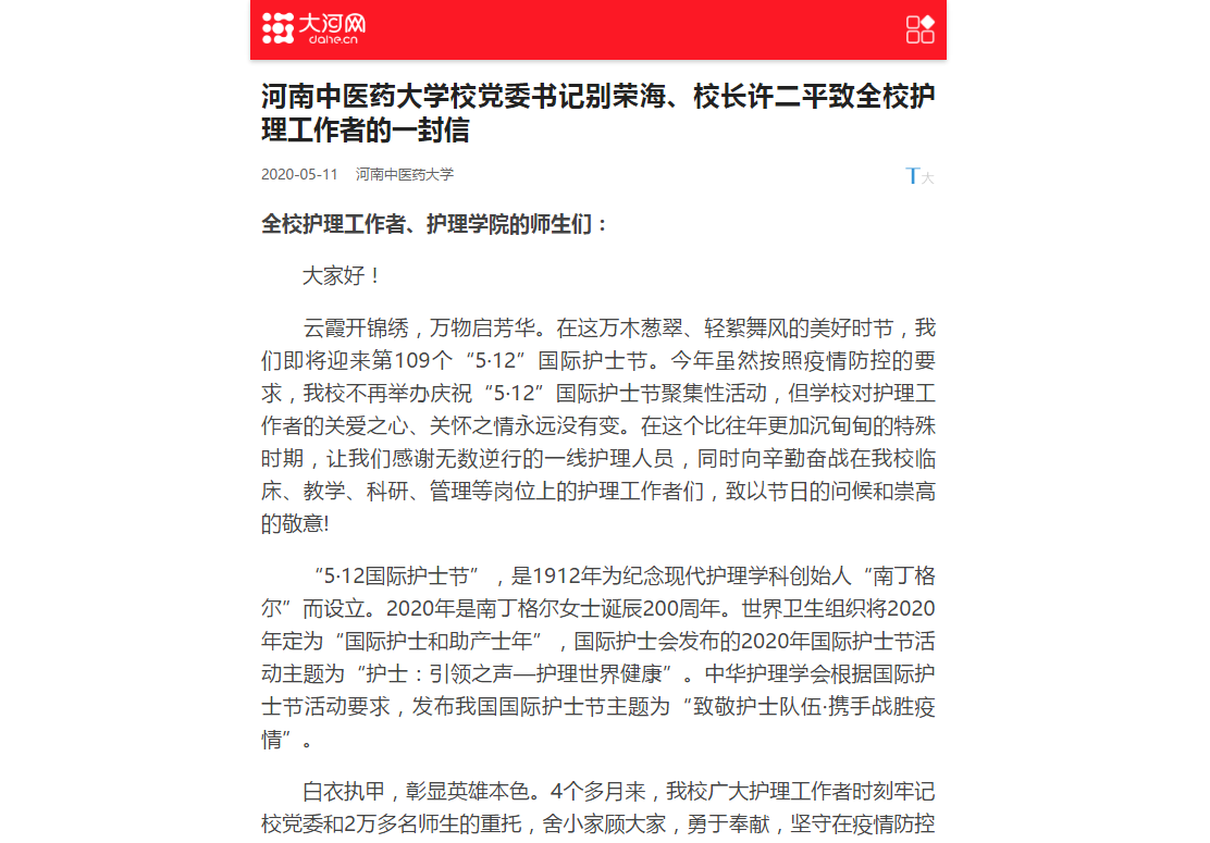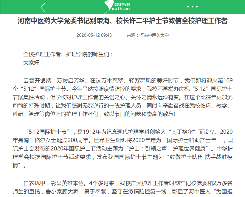 编者按:2020年5月11日-12日,中青网、中国网、环球网、大河网、网易新闻等媒体对leyu·乐鱼(中国)体育官方网站党委书记别荣海、校长许二平致全校护理工作者的一封信进行报道。