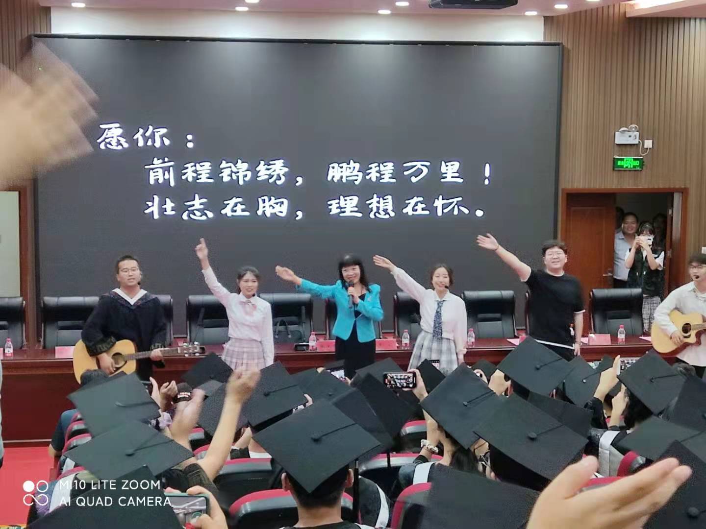 在轻松欢快的旋律中,焦钧从会场一侧缓缓走出,唱响《夜空中最亮的星》,全场与会人员深受感染,一同挥动手臂,放声歌唱,愿每位同学都能成为最闪亮的一颗星。大屏幕中播放着满载着毕业生的蜕变与成长的照片,现场歌声中饱含着老师对学生的不舍和祝福,使现场气氛达到了高潮。全场毕业生一起挥动双手,向美好快乐的大学生活告别,同时迎接充满憧憬的未来。