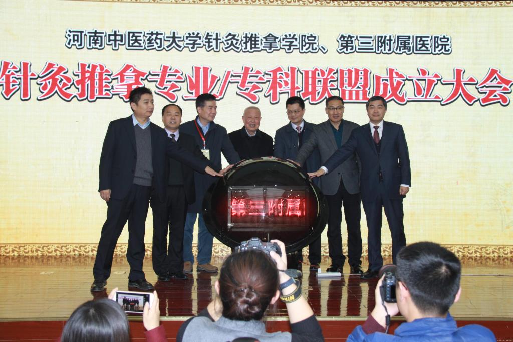 国医大师张磊、省中医管理局医政处处长姬淅伟、中国针灸学会副会长刘智斌、李建生副校长与三附院党委书记周运峰、院长张大伟与针灸推拿专业/专科联盟主委、三附院针灸推拿学科主任高希言共同点亮联盟成立启动球