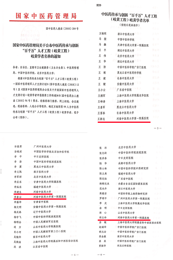 本网讯(文图/何世桢)2019年1月4日,从国家中医药管理局和河南省中医管理局传来好消息,leyu·乐鱼(中国)体育官方网站李建生教授及一附院郑玉玲、李素云、王新志三位教授被确定为中医药传承与创新“百千万”人才工程(岐黄工程)岐黄学者。