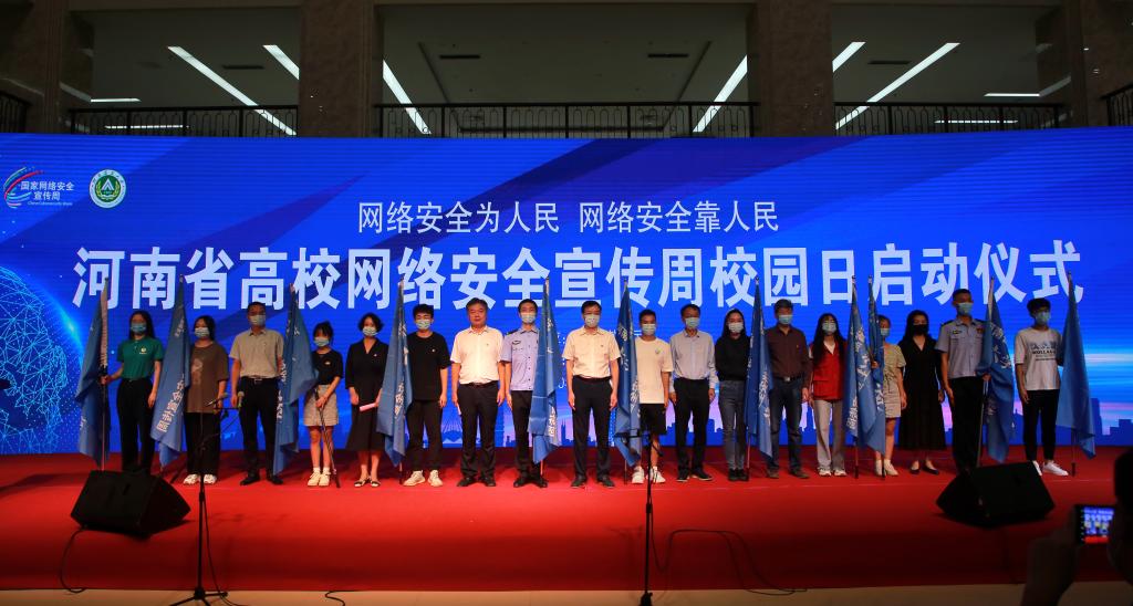 本网讯(文/李冕 图/班赛博 谭晟吾)2020年国家网络安全宣传周于9月14日至20日在全国范围内开展,网络安全高峰论坛等重要活动在河南郑州举行。今年活动的主题为“网络安全为人民,网络安全靠人民”。9月15日,河南省高校网络安全宣传周校园日启动仪式在河南农业大学举行。河南省委高校工委专职委员何秀敏、河南省高校工委、省教育厅思政处一级调研员张延华、河南农业大学党委书记魏蒙关、河南农业大学副校长杨喜田等出席启动仪式,仪式由河南农业大学党委副书记、工会主席李成吾主持。校新闻中心王秋安、李冕老师带领新媒体(校报)记者团10名学生记者应邀参加此次活动。