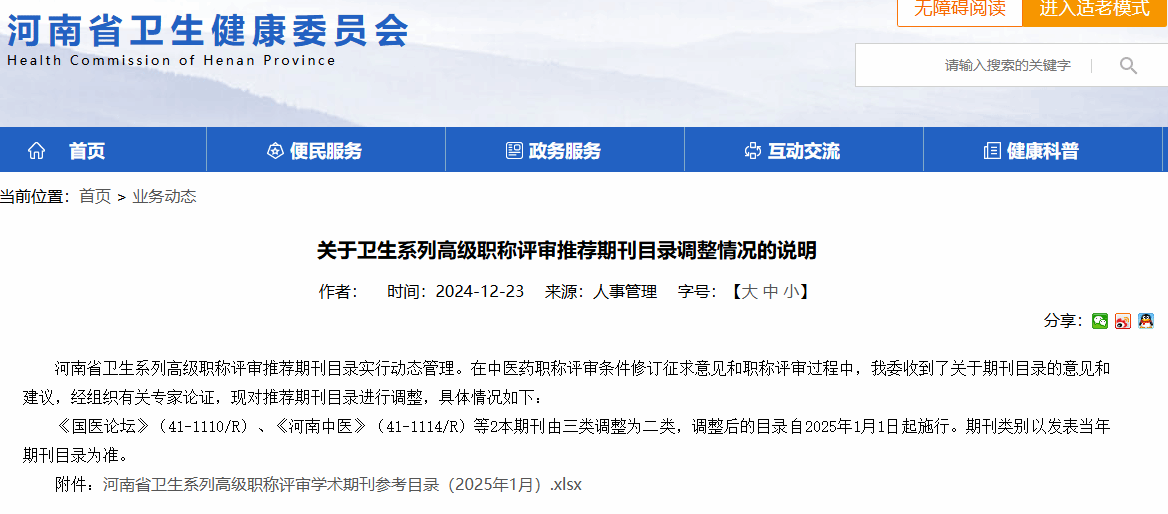 本网讯(文/倪婷婷 图/李华)2024年12月23日,河南省卫生健康委员会发布了最新版的《河南省卫生系列高级职称评审学术期刊参考目录(2025年1月)》,《河南中医》晋升为河南省卫生系列高级职称评审二类学术期刊。该目录自2025年1月1日起施行。
