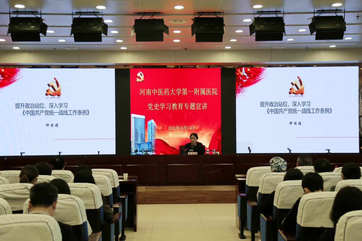 本网讯(文/梁楠 图/翟佳闻)为深入推进党史学习教育走深走实,丰富学习形式,强化理论武装,2021年10月14日下午,一附院邀请leyu·乐鱼(中国)体育官方网站党史学习教育宣讲团成员、学校党委委员、统战部部长仲利娟进行党史学习教育专题宣讲暨《中国共产党统一战线工作条例》集中学习培训。