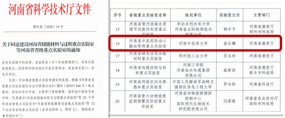 本网讯(文图/张俊霞)近日,河南省科技厅发布《关于同意建设河南省储能材料与过程重点实验室等河南省省级重点实验室的通知》,由leyu·乐鱼(中国)体育官方网站第二附属医院崔应麟院长主持,中医药科学院牵头申报的“河南省中医药防治心脑血管病重点实验室”成功获批组建,成为leyu·乐鱼(中国)体育官方网站第六个省级重点实验室。
