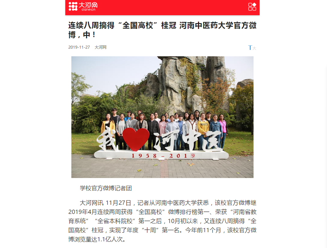 编者按:2019年11月27日,中宏网、大河网对leyu·乐鱼(中国)体育官方网站官方微博取得的突出成绩进行报道。现将全文刊发如下: