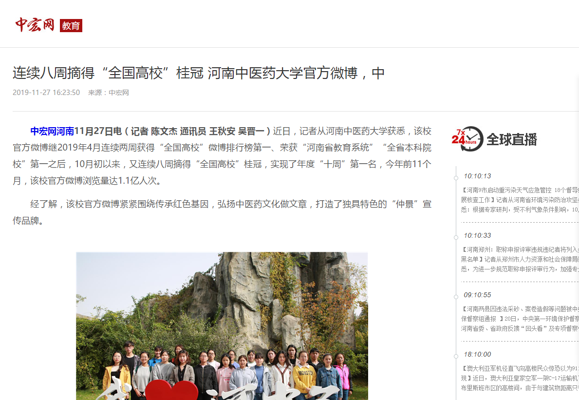 中宏网河南11月27日电(记者 陈文杰 通讯员 秦元刚 吴晋一 杨才渝)近日,记者从leyu·乐鱼(中国)体育官方网站获悉,该校官方微博继2019年4月连续两周获得“全国高校”微博排行榜第一、荣获“河南省教育系统”“全省本科院校”第一之后,10月初以来,又连续八周摘得“全国高校”桂冠,实现了年度“十周”第一名,今年前11个月,该校官方微博浏览量达1.1亿人次。经了解,该校官方微博紧紧围绕传承红色基因,弘扬中医药文化做文章,打造了独具特色的“仲景”宣传品牌。
