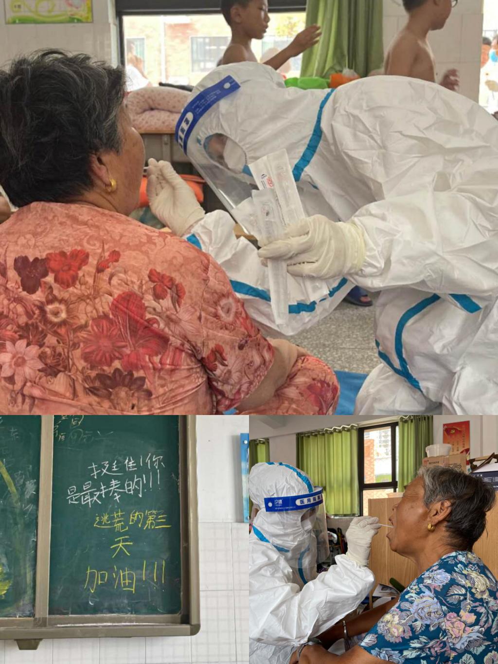 陋室虽简,却见真情!汛情导致居民聚集,孙雪倩负责一些安置点的核酸采样工作,连夜紧急学习全民核酸组织流程、信息收集和传导流程,及时培训辖区各处负责人,通宵领取并发放防疫物资、核酸采集配套物资,保障全民核酸检测如期开展。孙雪倩收样品、分配物资、处理协调各种问题,多次通宵达旦,圆满完成任务。安置点地上、桌子上,坐着的、躺着的村民们看到他们到来,纷纷起立鼓掌欢迎,高声感谢,她感动的忘记了防护服里浑身痛痒的湿疹,泪水和着汩汩而流的汗水奔涌而下,她更坚定了肩上的责任和使命!