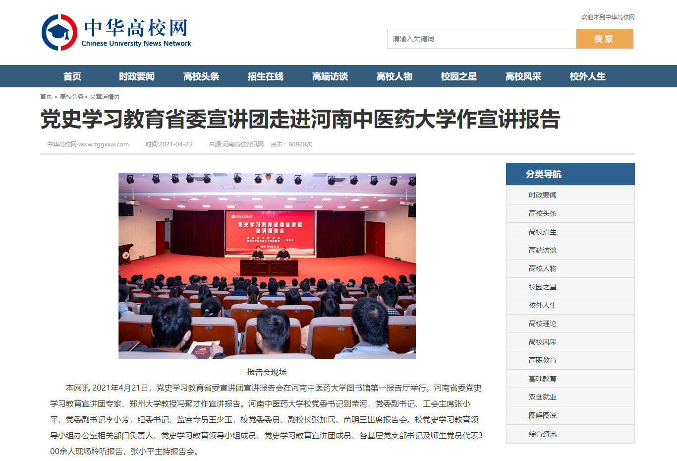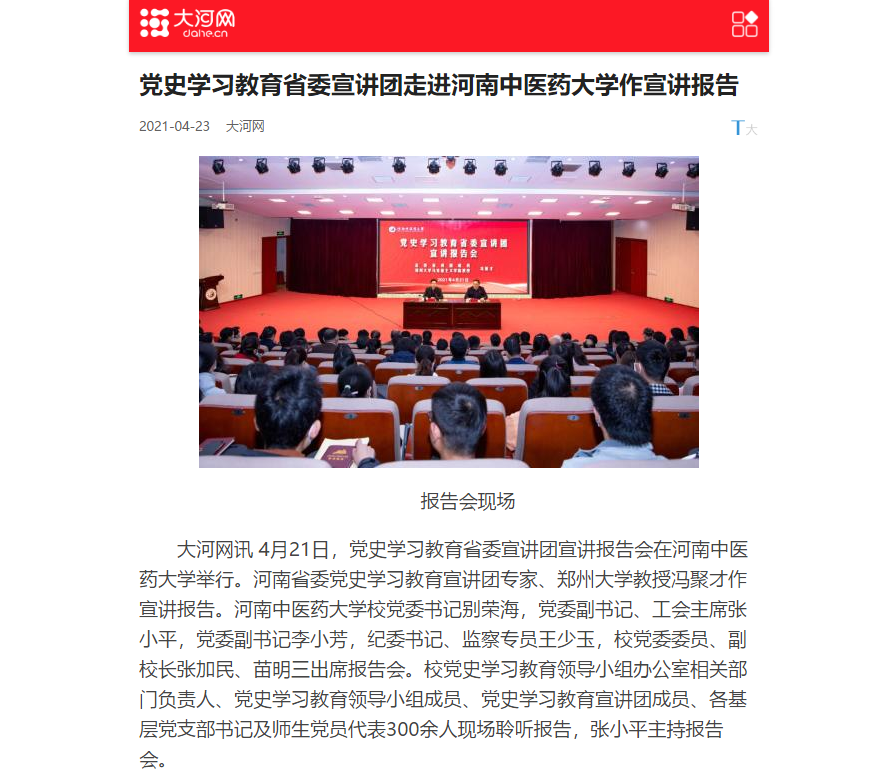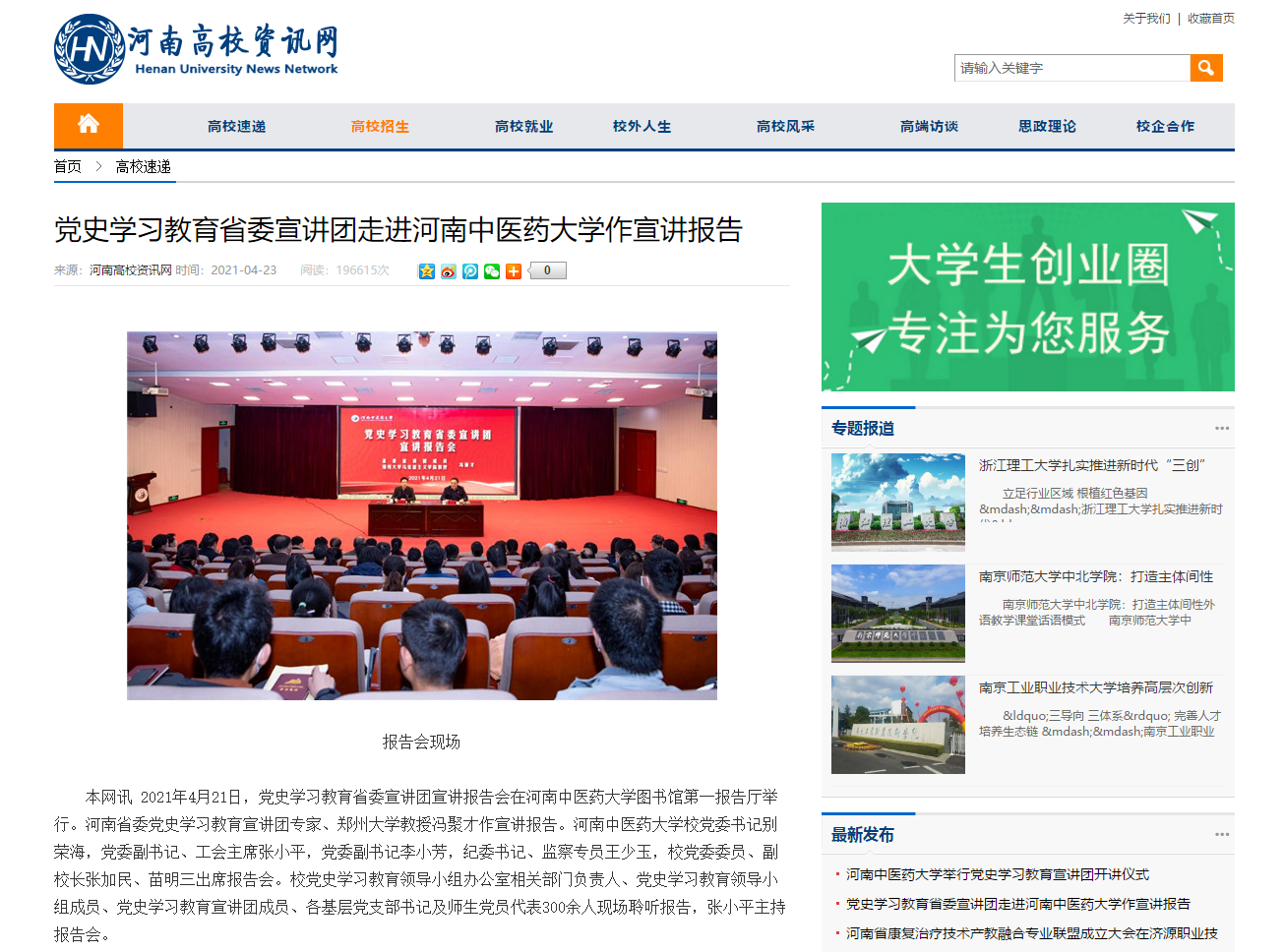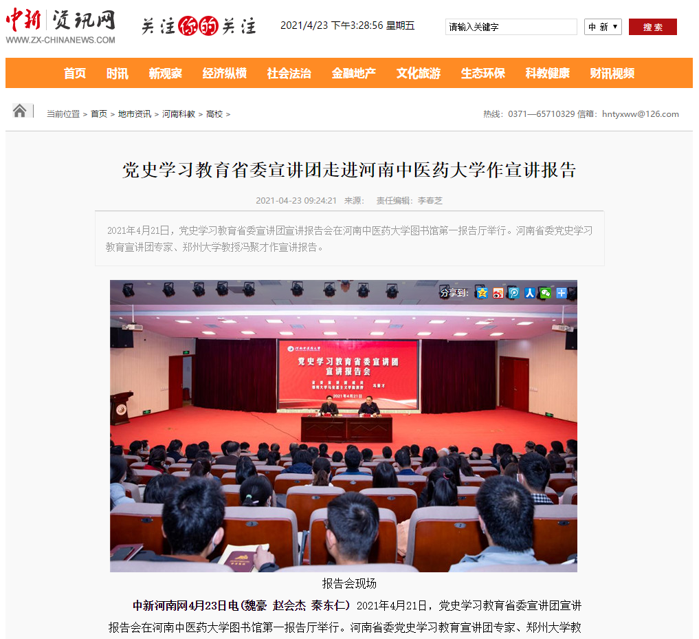 编者按:2021年4月23日,中新资讯网、中华高校网、大河网、河南高校资讯网、网易新闻等多家媒体对党史学习教育省委宣讲团走进leyu·乐鱼(中国)体育官方网站作宣讲报告进行报道。