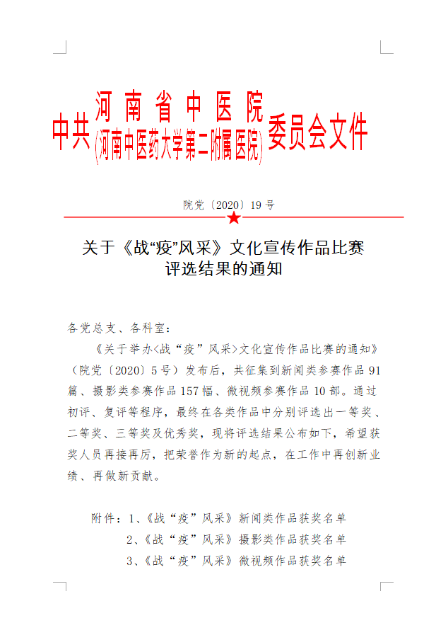 自院党〔2020〕5号《关于举办<战“疫”风采>文化宣传作品比赛的通知》发布后,共征集到新闻类参赛作品91篇、摄影类参赛作品157幅、微视频参赛作品10部。7月13日,《战“疫”风采》文化宣传作品比赛的评选结果出炉。各类别参赛作品经专家严格打分和认真评议,通过初评、复评两轮筛选,最终在新闻类、摄影类、微视频等参赛作品中产生一等奖2名、二等奖4名、三等奖6名和优秀奖23名。现将获奖作品及名单予以公布,希望获奖人员再接再厉,把荣誉作为新的起点,在工作中再创新业绩、再做新贡献。