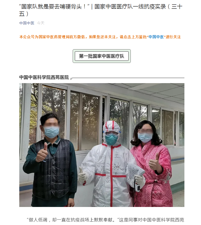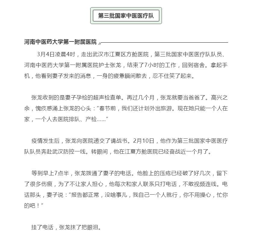 编者按:2020年3月8日,国家中医药管理局官方微信对leyu·乐鱼(中国)体育官方网站一附院援鄂医护人员事迹进行报道。现将部分文章刊发如下: