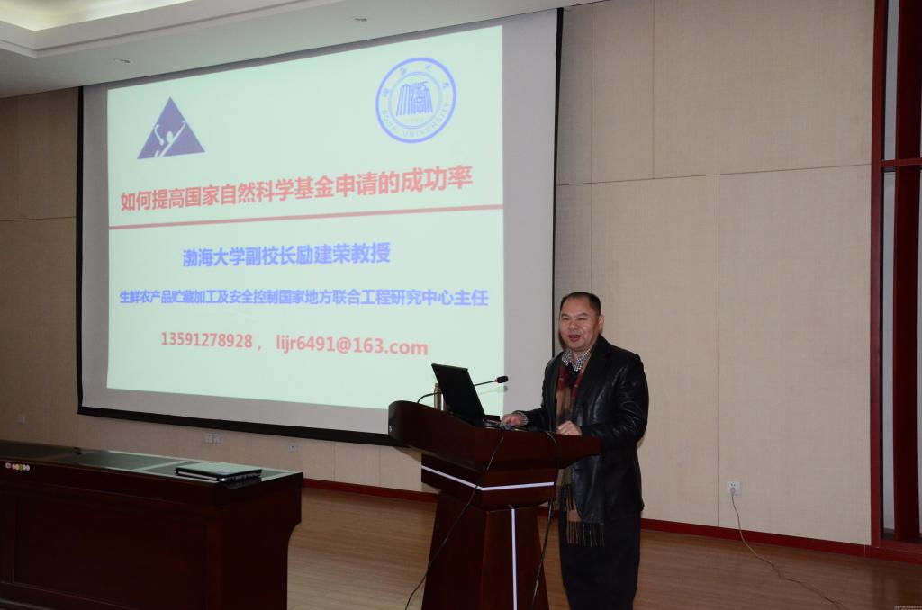 励建荣教授结合自身多年国家自然科学基金项目申报和评审的经验,对国家自然科学基金的申报程序、撰写前的准备工作、如何撰写申报书等方面的问题进行了深入浅出的讲解。重点围绕基金申请存在的问题及基金申请书撰写的注意事项作了详细阐述。最后对渤海大学食品学科做了简要的介绍。