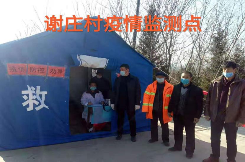 2018级针灸推拿学院专升本三班宋琦,在山西省长治市苏店镇义堂村协同工作人员为过往人员测量体温及信息登记。