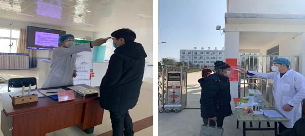 2018级针灸推拿学院专升本四班任飞,在甘肃省陇南市西和县谢庄村与当地机关人员并肩作战在防疫前线,测量体温,记录信息,严控过往车辆和人员。