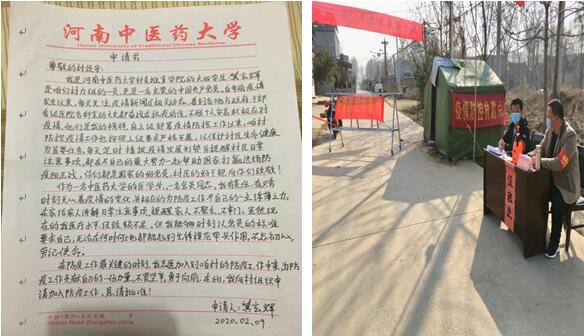 2018级针灸推拿学院专升本四班冀玄辉,积极的向当地的村组织申请加入本村的疫情防控执勤工作。在河南省许昌市禹州市鸿畅镇冀村负责执勤点过往车辆及人员的体温测量、信息登记。