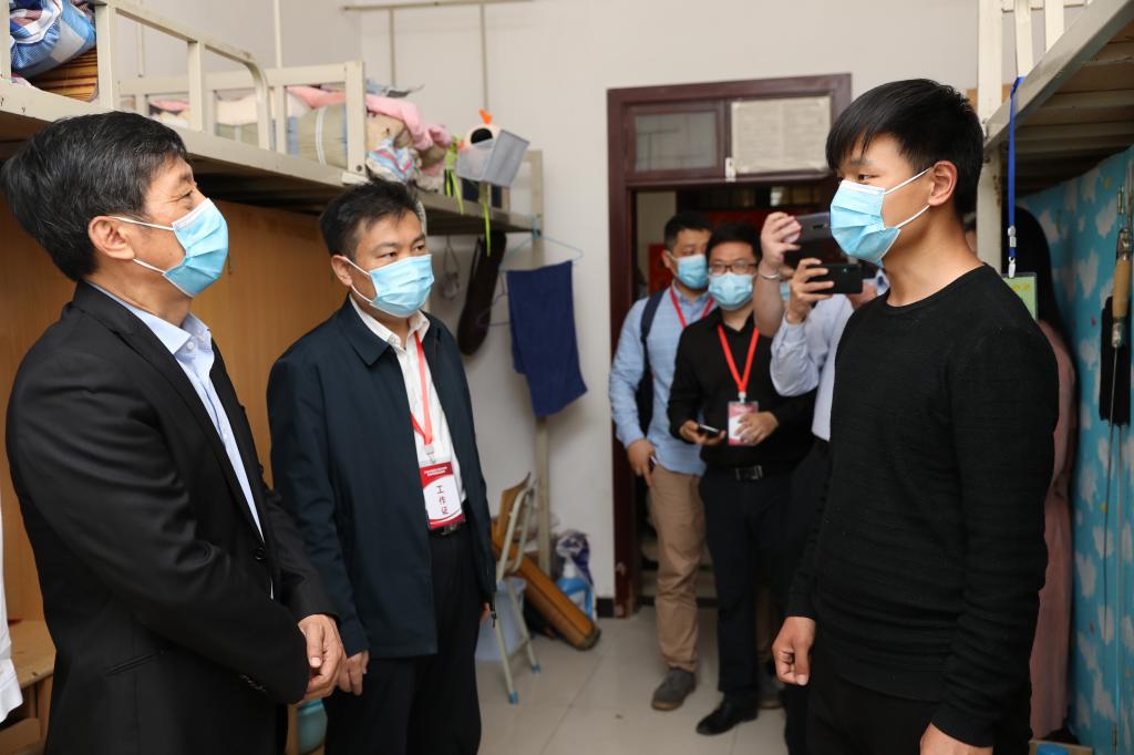 校长许二平先后到健康筛查结果等候区、学生宿舍与多名同学进行亲切交谈,详细询问了他们在假期中的学习、生活情况。几名同学分别向许校长介绍了自己进行网络课程学习的过程、效果和体会。在交谈中,当许校长得知大家对返校复学后学校疫情防控的有关要求、应对办法都有充分了解时,高兴地说,大家在学习过程中要按照学校有关要求,在做好自身防护的同时,互相之间多提醒、多帮助,共同做好科学防控,学校也会想方设法,竭力保障好同学们的学习和生活。在学校北大门,许二平亲切看望慰问了正在忙碌的工作人员,详细询问了教职工、外来人员进出校门体温检测、审核登记情况,对同志们坚守岗位、履职尽责的奉献精神给与充分肯定,并对如何进一步加强教职工出入的信息查验、外来人员的审核把关等提出了具体要求。
