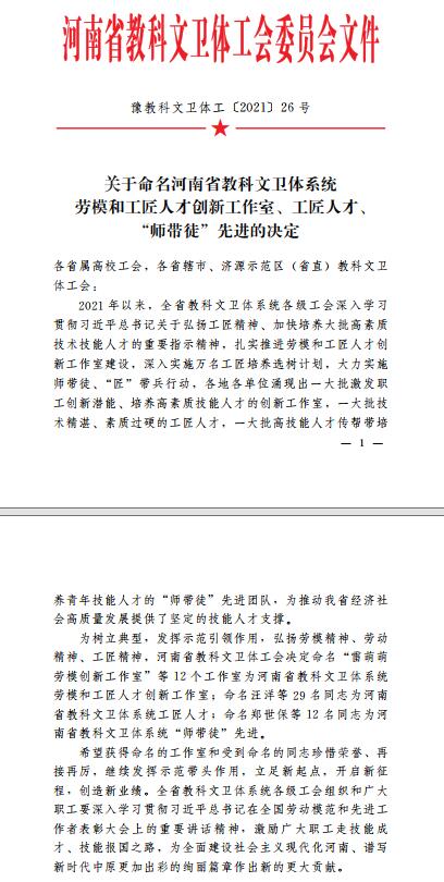 希望获得命名的工作室和受到命名的同志珍惜荣誉、再接再厉,继续发挥示范带头作用,立足新起点,开启新征程,创造新业绩。全省教科文卫体系统各级工会组织和广大职工要深入学习贯彻习近平总书记在全国劳动模范和先进工作者表彰大会上的重要讲话精神,激励广大职工走技能成才、技能报国之路,为全面建设社会主义现代化河南、谱写新时代中原更加出彩的绚丽篇章作出新的更大贡献。