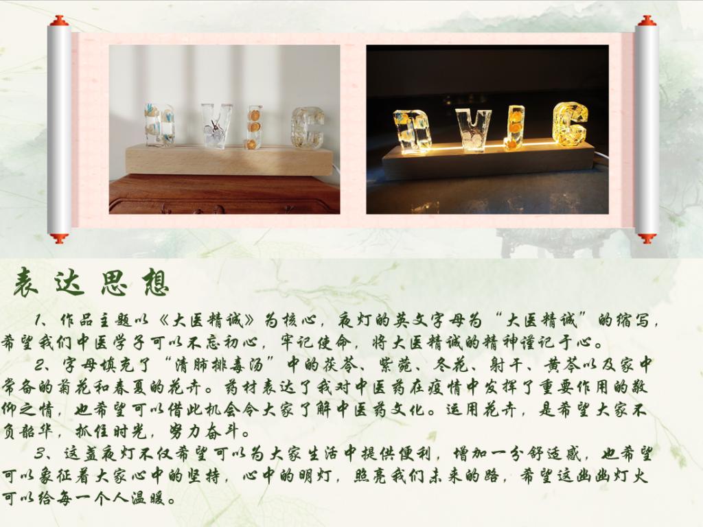 大医精诚,彰显文化自信。为弘扬中医药文化,传承大医精诚精神,第一临床医学院举办了“中医药伴我成长”活动,同学们通过微视频、图文和手工艺品制作,更加深入了解中医药在疫情中发挥的重要作用,增强了文化自信和专业自信。
