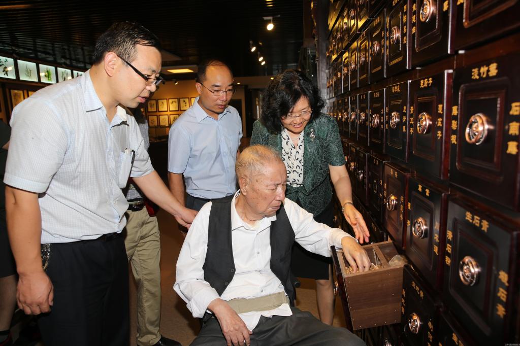 李老在河南中医药博物馆中药馆察看展馆的中药饮片