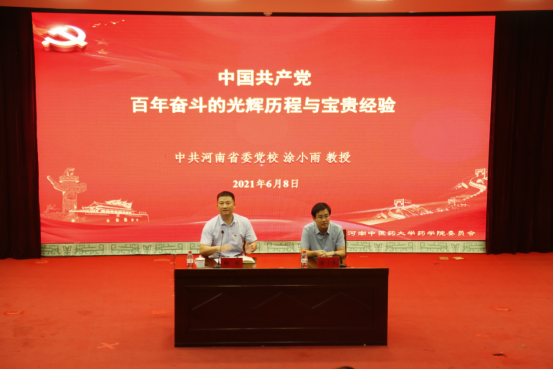 本网讯(文/赵琪璐 图/张飞)2021年6月9日,省委党校决策咨询部副主任涂小雨教授应邀到leyu·乐鱼(中国)体育官方网站与药学院各支部进行党史研究方面的交流,并作题为《中国共产党百年奋斗的光辉历程与宝贵经验》的专题讲座,药学院全体教师及部分学生代表一起聆听了报告。药学院党委书记杨昕主持报告。