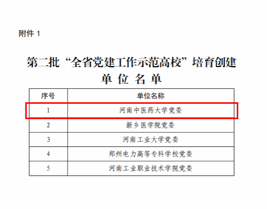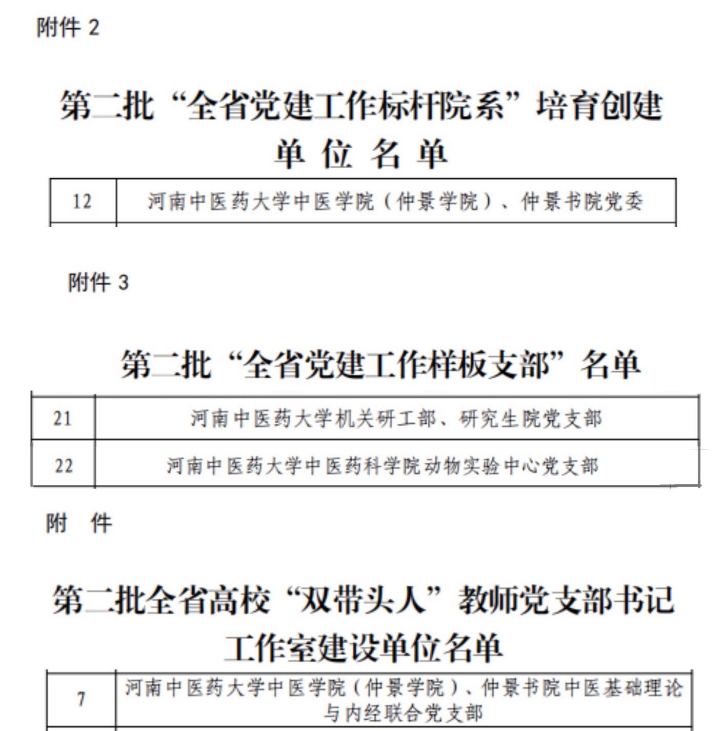 本网讯(文/翟羽佳)近日,河南省委教育工委公布了第二批全省高校党建工作强基引领“三级联创”评选结果,学校党委获批“全省党建工作示范高校”培育创建单位;中医学院(仲景学院)、仲景书院党委获批“全省党建工作标杆院系”培育创建单位;机关研工部、研究生院党支部、中医药科学院动物实验中心党支部获批“全省党建工作样板支部”;中医学院(仲景学院)、仲景书院中医基础理论与内经联合党支部获批全省高校“双带头人”教师党支部书记工作室建设单位。